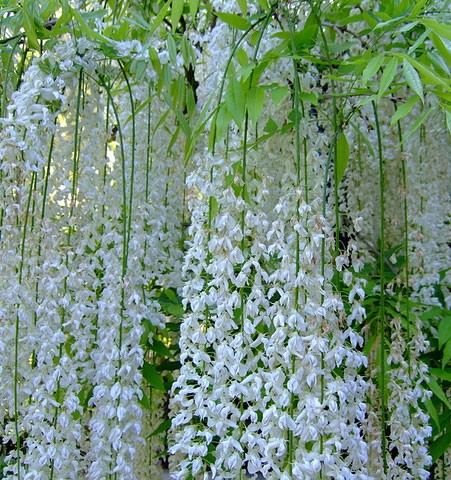 Глициния 'Белый Ангел' (Wisteria sinensis 'Alba') - это разновидность глицинии с белыми цветами, которые создают впечатляющий вид в саду или ландшафте. Многолетняя лиана с одеревеневшими гладкими побегами, способная вырастать до 15-20 метров в длину. Листья 'Белого Ангела' овальной формы, сложные, непарноперистые, собранные по 7-13 штук, длиной 6-8 см и шириной около 3 см. Лоза в диаметре может достигать 40 см и вьется по любой опоре. Все бутоны 'Белого Ангела' распускаются одновременно или от основания к верхушке, с тонким ароматом или без него. Плоды густо опушенные бобовые стручки, до 15 см в длину, с несколькими плоско-округлыми семенами внутри черно-коричневого цвета. Глициния 'Белый Ангел' также является листопадным растением.